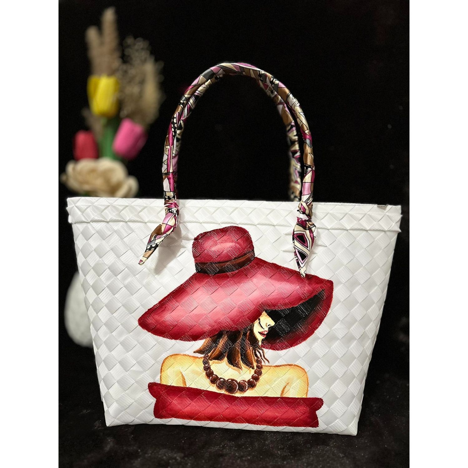 WHITE HAND PAINTED BAYONG BAG GIRL IN RED HAT